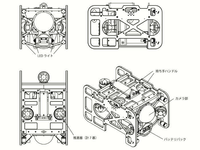 ホームページで公開されているFullDepth DiveUnit300の本体外観図。大型ROVとは相反して、最小限の機能にとどめられている