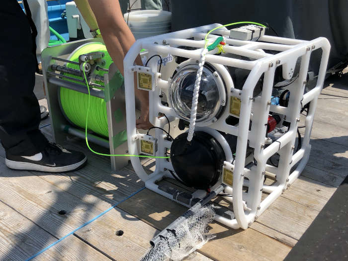 小型ROV「FullDepth DiveUnit300」の実機。海やダムで既に稼働しているため、よく見るとフレームには成果の証も