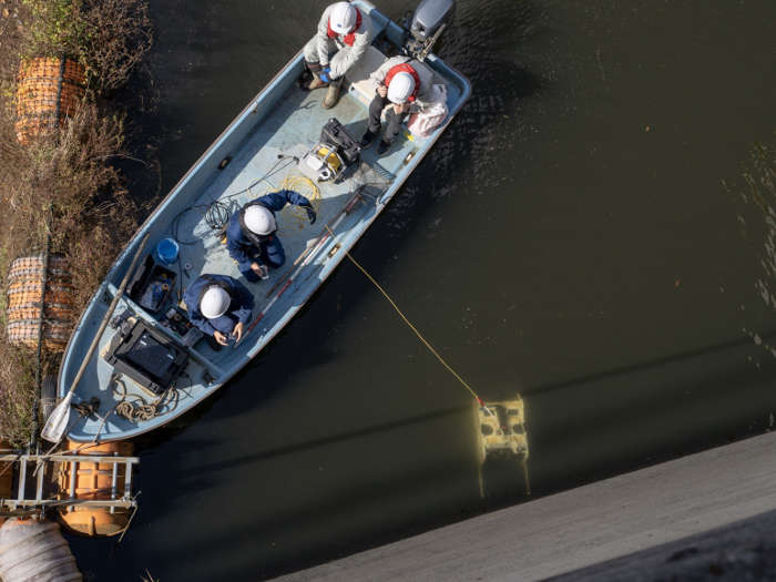 茨城県にあるダムの水中壁面をカメラで調査。本体と船上は通信用の光ファイバケーブルでのみつながっている