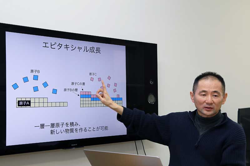 原子を一つずつ積み上げて作られるエピタキシャル薄膜の成長について解説してくれた