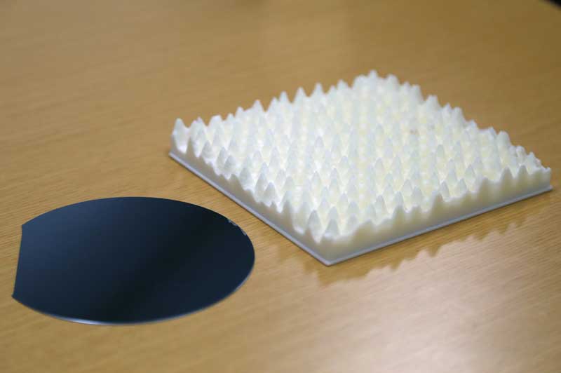 半導体素子を作るための材料として用いられるシリコンウェハー(左)と、その表面であるシリコン原子の結晶構造を電子顕微鏡で観察し、3Dプリンターで出力したもの(右)