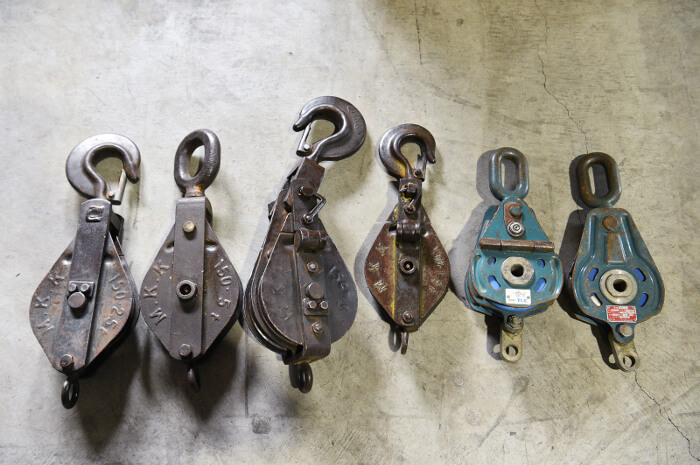 電線を張り替える際、一時的につるしておくための器具、金車。標準的なもので10~15kgもの重量があり、これらも全て作業員が高所まで持っていく