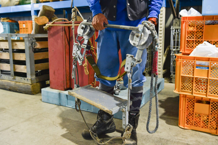 高所作業の際は命綱を装着するほか、工具類にいたるまで全てひもにつないで落下を防止する