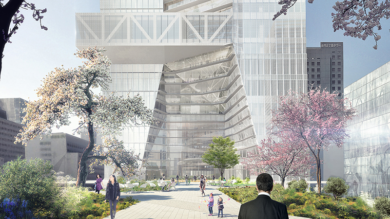 「虎ノ門ヒルズ ビジネスタワー」の低層部イメージ。大規模オフィスと商業施設を持つ。1階には、都心と臨海エリアを結ぶBRT(バス高速輸送システム)の発着点となるバスターミナルなどを設置し、世界と都心をつなぐ「東京の玄関口」として機能させる狙い