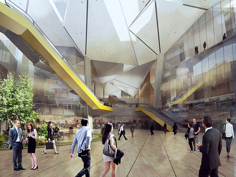 虎ノ門ヒルズ ステーションタワーの駅前広場イメージ。地下鉄のコンコースに接続する地下2階から地上1階まで3層吹き抜け。天井からは自然光を取り入れる