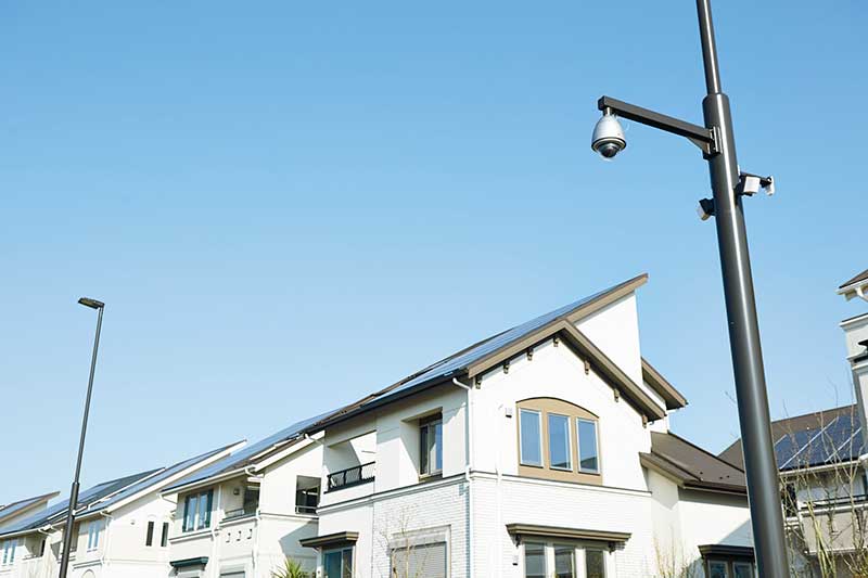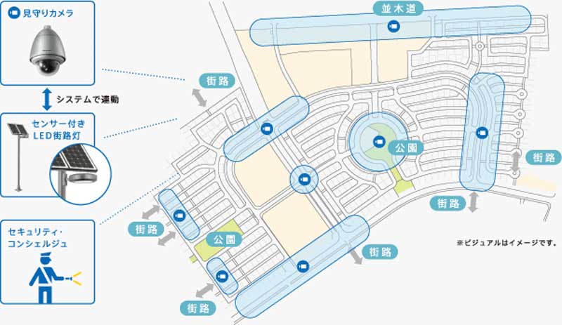セキュリティ分野では、まず街の出入り口を限定し、エリア全体として約50台ものカメラで見守りを行っている。