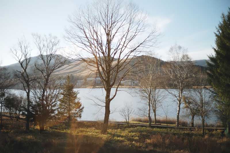 「SANU 2nd Home」の一つ、白樺湖の風景。キャビンのウッドデッキでコーヒーを飲みながら豊かな時間を過ごすことも