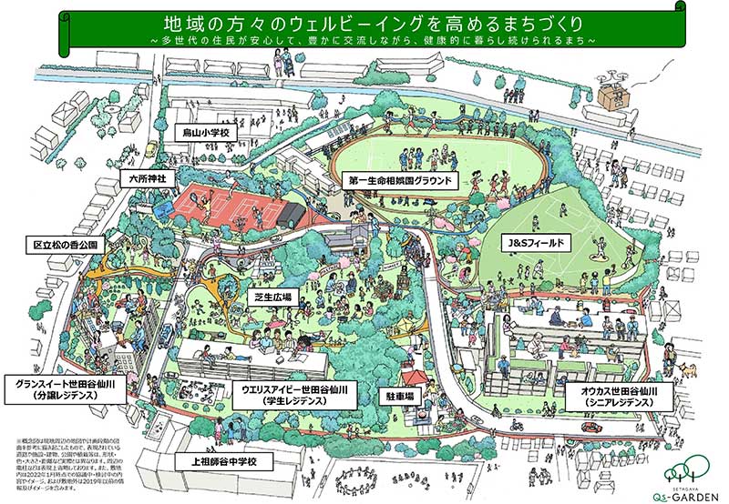「SETAGAYA Qs-GARDEN」の概念図。南側に学生寮やファミリー向け分譲マンション、高齢者向け住宅を各区画にバランスよく配置。意図的に多世代が集う仕組みが採用されている。丸紅都市開発株式会社、相互住宅株式会社、NTT都市開発株式会社、野村不動産株式会社を事業パートナーとして開発が進行中だ