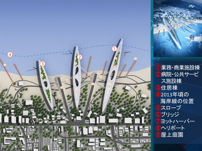 「建物は業務・商業施設棟、病院・公共サービス施設棟、住宅棟からなり、人口はそれぞれ2800人、2000人、1700人ぐらいの小さな街として機能できる規模で提案しています。街は海に出っ張る形で、地上30mに設置するものとしました。仮に東日本大震災レベルの津波が押し寄せたとしても建物には届かず、また3本の柱は津波の力を受け流すことができます」(葛西さん)