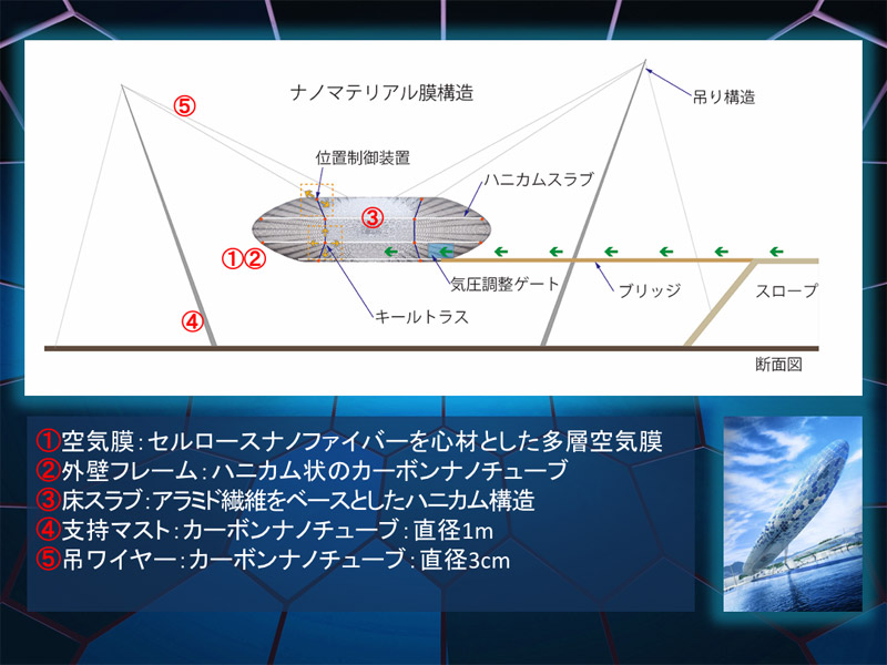 やがてナノマテリアルで“空気膜”を造り、東京ドームのように内側から圧力をかければ、空中に吊り下げられる建物ができるのではないかという着想を得る。