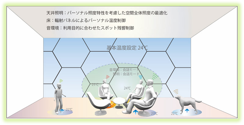 「ナノマシンは、その研究者(仏・英・蘭の大学教授3氏)が2016年にノーベル化学賞を受賞したことで注目されました。ですので、『FUWWAT2050』の発表時点では、将来的に実現可能であろうという予想に基づくコンセプト提案でした。建物の中はスマホの画面のようにツルッとしたものになって、壁自体が照明にもなればモニターにも、通信機器にもなります。例えば、室温や照度など、一人一人の好みに合わせて室内環境が自動的に変化するということも可能になります」(葛西さん)