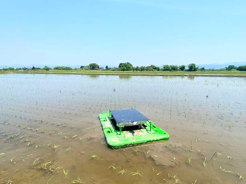 ヤマガタデザインアグリは水田に浮かべる自動抑草ロボット「アイガモロボ」を開発。水稲の有機栽培で最も工数のかかる除草作業の省力化に取り組んでいる