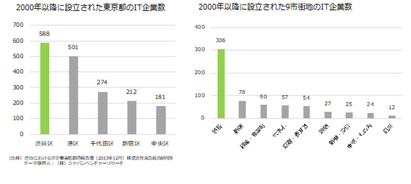 また、遊ぶ場所としてのイメージが強い渋谷ですが、実はIT企業の設立数が都内ナンバーワンだったり(※下のグラフ参照)、クリエイティブコンテンツ産業が集積している地だったりと、ビジネス街としての側面も持っています。しかし一方ではオフィスの床面積が足りていない、という課題もあります。
