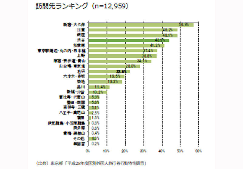 さらに、インバウンドの側面から見ると、渋谷は新宿、浅草、銀座に次いで4番目の訪問先となっています(※下のグラフ参照)。スクランブル交差点は日本一外国人が訪れる場所といわれているし、渋谷にはライブハウスや映画館があって、ナイトライフを楽しめる環境もある。