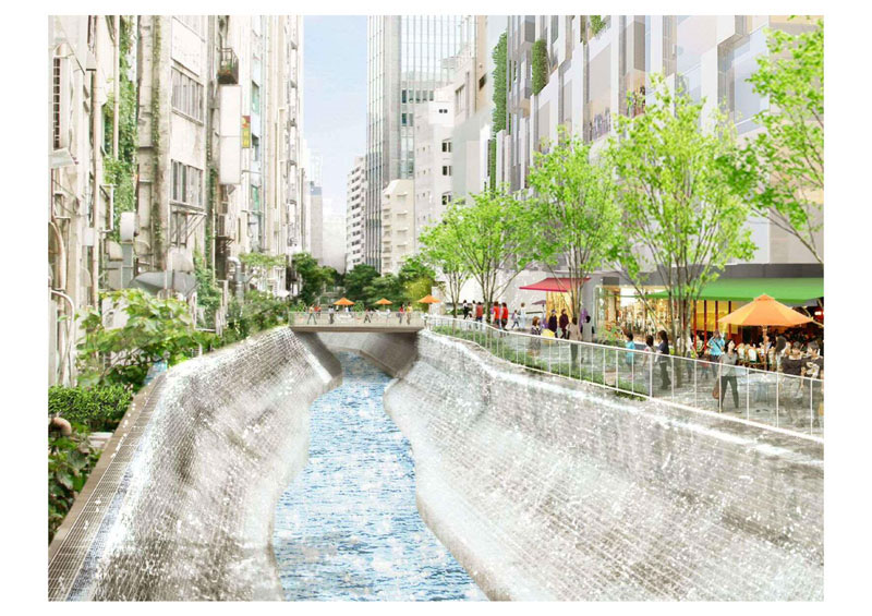渋谷川の再生イメージ。渋谷ストリームを起点に約600m代官山方面が生まれ変わる予定。清流復活水を活用した「壁泉(へきせん/水景施設)」により再生し、緑豊かな潤いある水辺空間を創出する