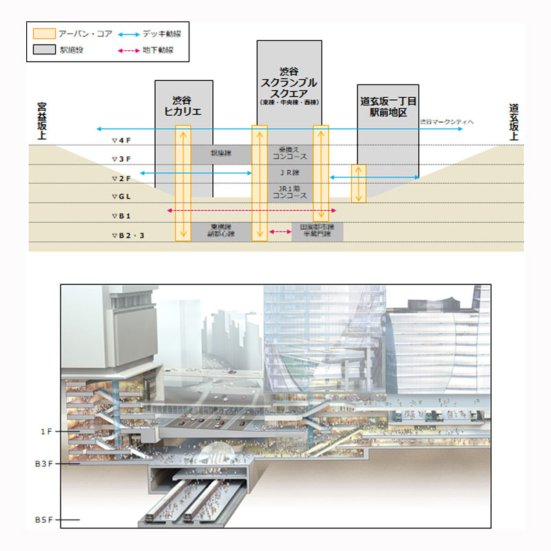 「渋谷スクランブルスクエアと渋谷ヒカリエ、渋谷ストリーム、道玄坂一丁目駅前地区、渋谷マークシティはそれぞれデッキでフラットにつながる予定で、将来的には渋谷駅桜丘口地区もつながります。このデッキと一緒に『アーバン・コア』と呼ばれる、エスカレーターとエレベーターを配置した縦軸空間も生まれます。