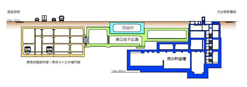 渋谷駅東口側 地下工事断面図。すり鉢地形の最も低い位置に駅があるが、この貯留槽の整備によって、安全安心な街づくりが実現する