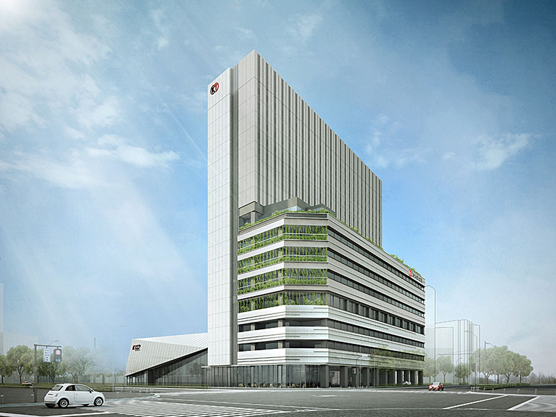 株式会社コーエーテクモゲームスが2020年に完成予定の新本社オフィス(収容規模約1600人)、ライブハウス型ホール(収容規模約2000人)、ホテルなどの複合施設のイメージパース