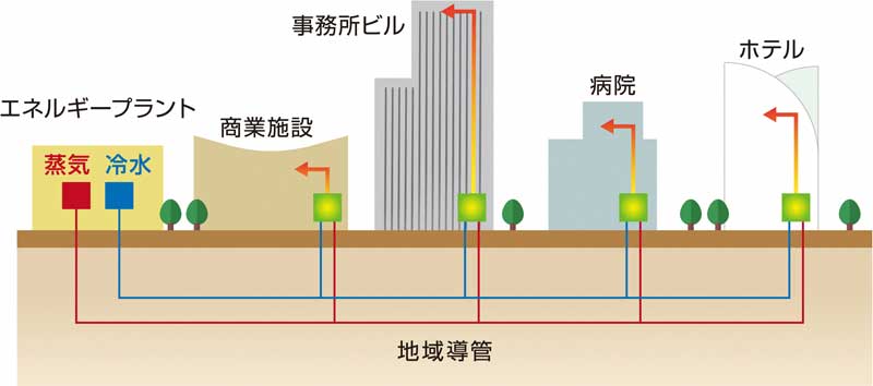 エネルギープラントからパイプラインを通してそれぞれのビルに温熱や冷熱が送られる