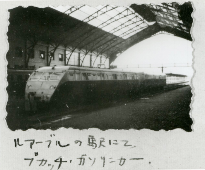 世界旅行中のワンカット。1936(昭和11)年、フランスのルアーブル駅にて。ブガッティ・ガソリンカー(内燃動車)。自動車メーカーのブガッティは、1931(昭和6)年からガソリンカーの開発に取り掛かり、1933(昭和8)年にスポーツカー用エンジンを搭載した流線形車両を完成させる。短編成だが、「ムカデ式」の一種