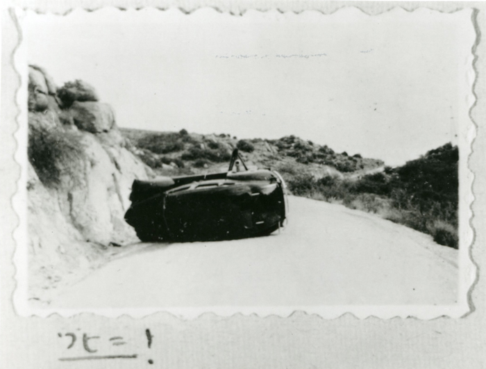 フォードの「デラックス・ツーリング・セダン」で走行中に横転した島秀雄。相当飛ばしていたとみられ、写真のキャプションに「ツヒニ!」とある