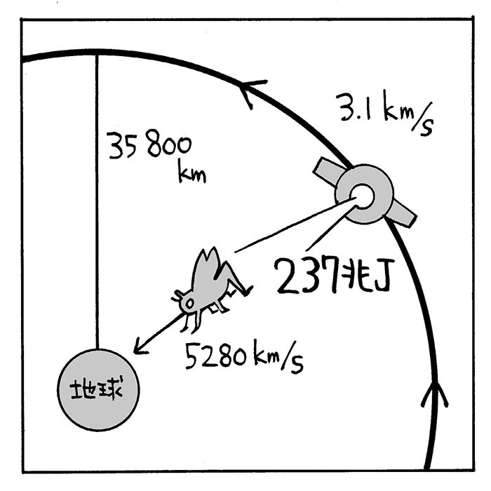 そもそも、このバッタを通信衛星から送るために必要なエネルギーとはいかほどか。通信衛星ゼアは、いつも日本上空にいるから、静止衛星と思われる。この場合、最も小さなエネルギーで地上に到達させる方法は、次のようになる。