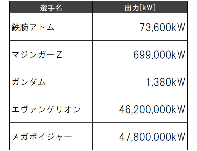 わあっ、メガボイジャーはエヴァンゲリオンを上回った! そしてガンダムは、アトムにも負けている! などということが、単位の統一によって一目瞭然となった。