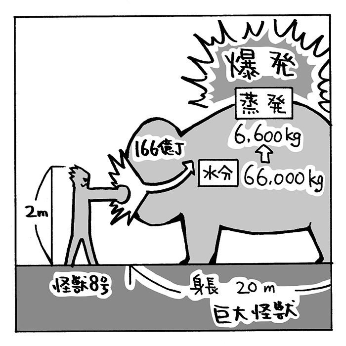 怪獣の体の水分が、人間と同じように体重の60%を占めるなら、水の重さは66t。その10分の1が蒸発すれば、体が爆発すると仮定しよう。