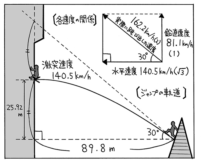 2度目も斜め上30度で跳んだとすると、水平速度は39.04[m/秒]=時速140.5km、進んだ距離は89.8m!