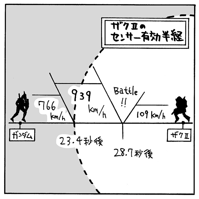 23.4秒後、ガンダムはザクのセンサー有効半径に入る。ザクもガンダムに向かって突進するが、そのとき既にガンダムは秒速213m=時速766kmに達している!