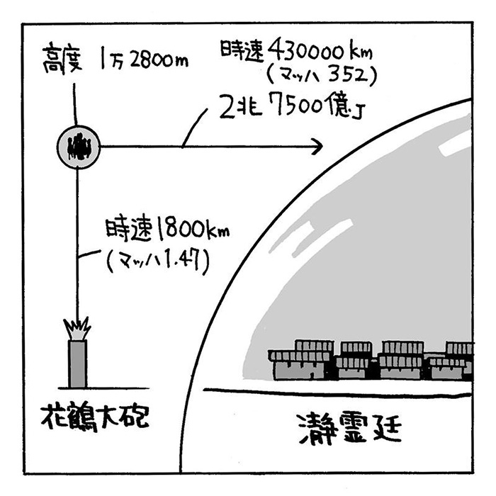 重力加速度とは、重力の強さを表す数値で、地球の場合は9.8[m/秒2]。平均して100m飛んだと仮定すれば、エネルギーは最低でも1/2×97万×9.8×100=4億7530万J。爆薬120kg分であり、破壊に必要なエネルギーの5倍! 合計は5億7230万Jで、爆薬144kg分!
