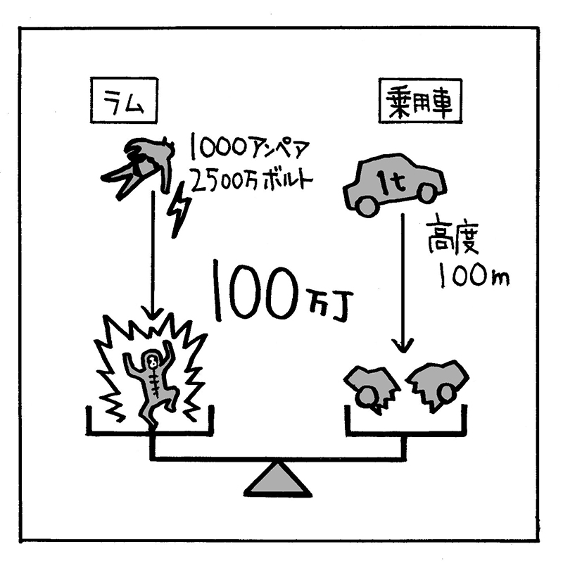 では、あたるの場合はどうなのか。雷の電流は1000~20万Aで、流れる時間は0.00008秒と言われる。ラムちゃんの電撃の電流が最も低い1000Aだとしても、移動する電荷は0.08C。
