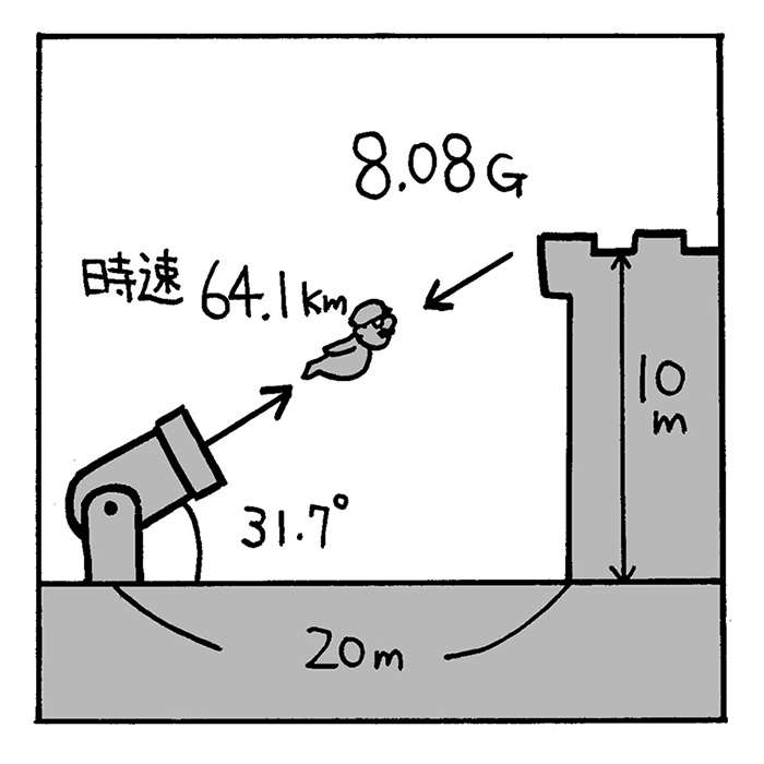 しかし、人間を大砲で撃ち出して、大丈夫なのか。全体像が映らないのでハッキリしないが、とりでの高さは10m、距離は20mほどあるようだ。