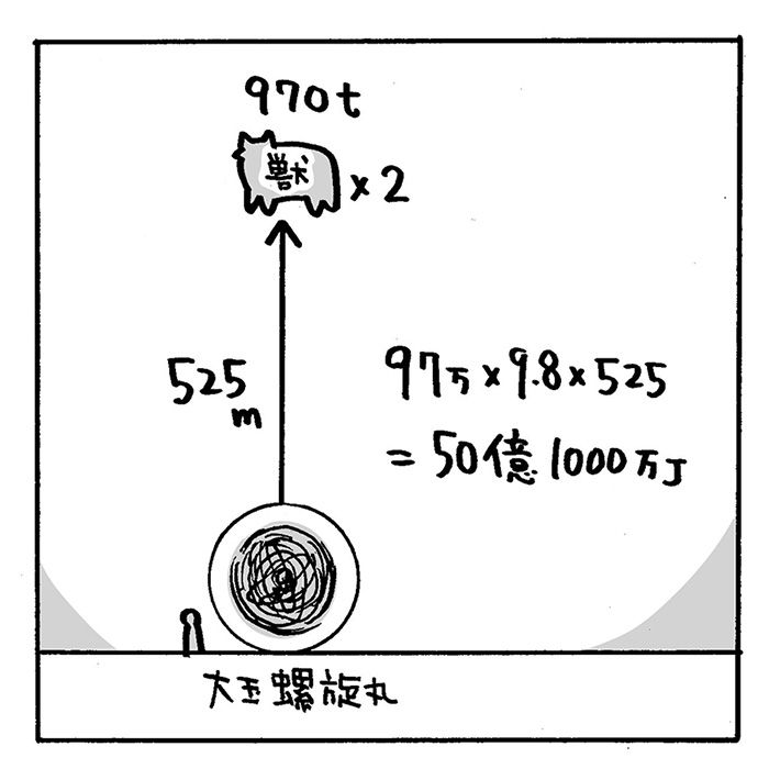 この式に「質量=970t=97万kg」「最高高度=525m」を代入すると、仙法 大玉螺旋丸のエネルギーは50億1000J。カブトに放った螺旋丸(43万2000J)の1万2000倍!