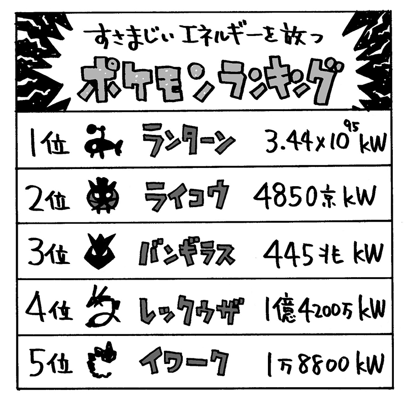 ここで選んだのは、5体のポケモンたち。彼らに関する記述を読むと、エネルギーそのもの(単位はJ)よりも、「1秒当たりのエネルギー」すなわち出力(科学では仕事率、英語ではパワー。単位はkW)で比べた方がよさそうである。