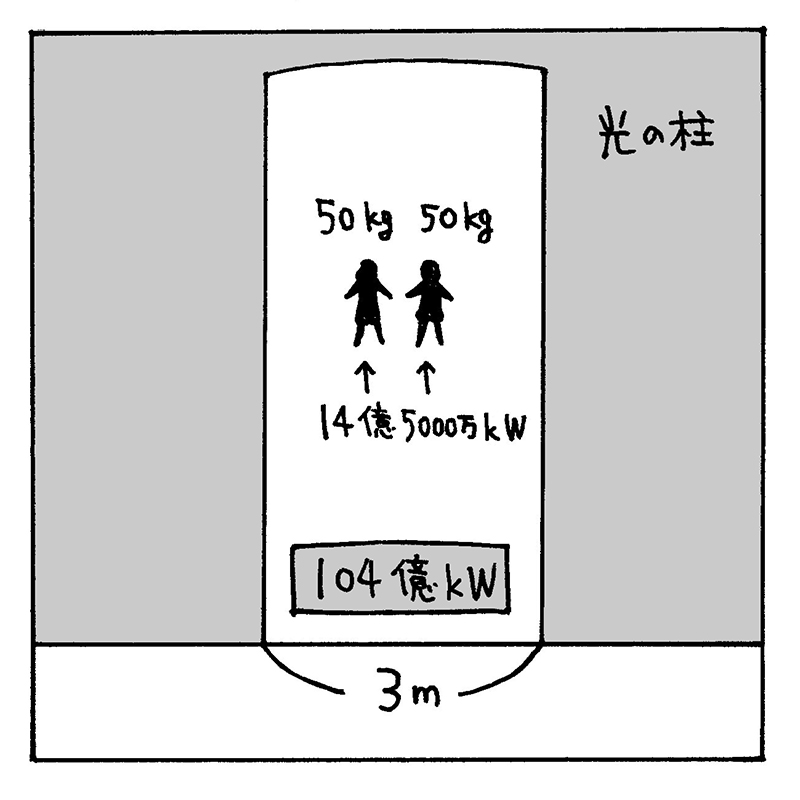 これに対して光の柱は直径3mほどもあった。ここから光の柱全体の出力を計算すると、104億kW。全世界の総発電力(33億kW)を大きく上回る!