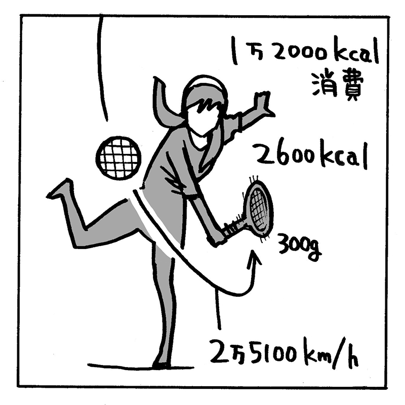 テニスでは、ラケットの速度マッハ20.5、エネルギー2600kcal。