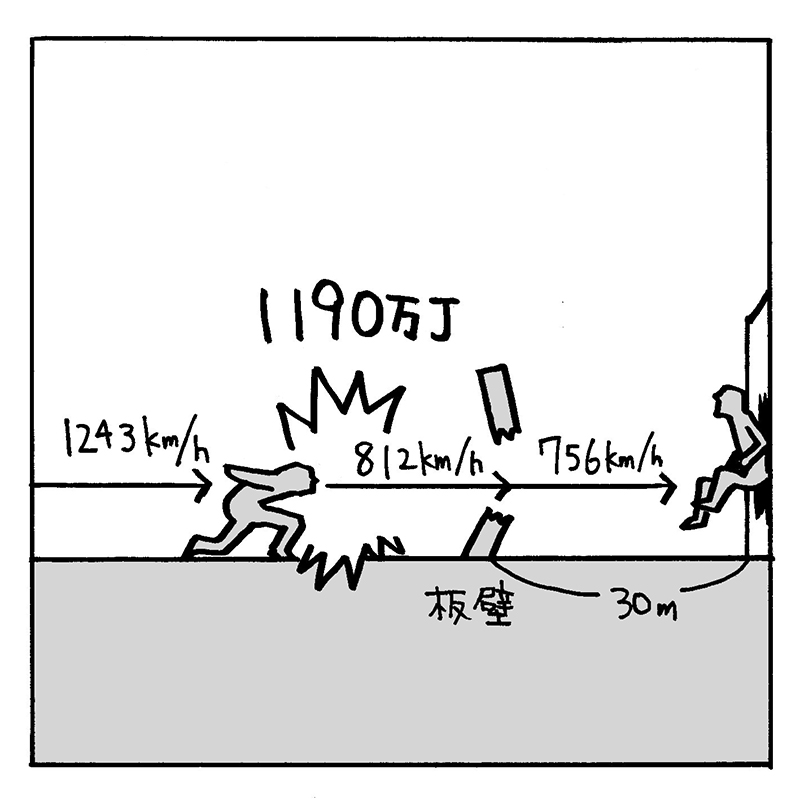 それでも、板壁にぶつかる前は、36万J+234万J=270万Jのエネルギーを持っていたことになる。飛ばされた速度は秒速226m=時速812kmだ!