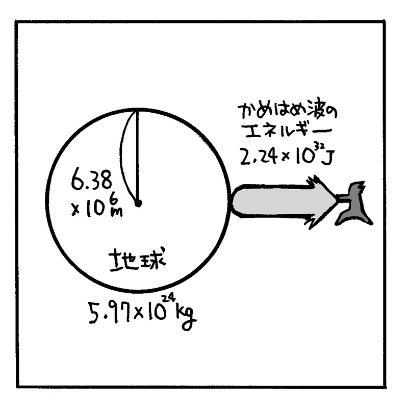 上の式に代入すると、このときのかめはめ波のエネルギーは2.24×1032J。全世界で消費するエネルギー(年間6.3×1020J)の3600億年分である!