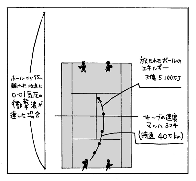「マッハ数」とは、速度が音速(気温15℃のとき秒速340m)の何倍かということ。また、同書によれば、0.0047~0.0142気圧の衝撃波は「小さい簡易窓を決定的に破壊する」。テニスボールの直径は6.7cm(6.54~6.86cmの中間値)、距離に関しては、観客収容数1万人の有明コロシアムの図面で測定すると、コート内から観客席の一番遠いところまで75m。