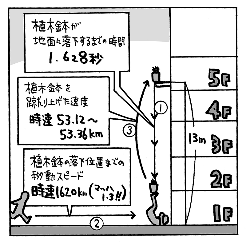 逆立ちの体勢で植木鉢を蹴り上げたが、植木鉢が足を離れた高度は地上1m90cmほど。5階の窓の高さは13mだから、植木鉢を11.1m上昇させたことになる。蹴り上げる瞬間の速度は、時速53.12kmだったはずだ。