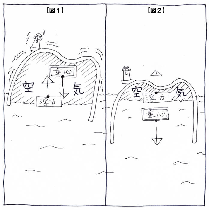 もちろん、実態はそうではないから、第2の方法。おわんを傾けながら沈めて、中の空気を出してもらいたい。出す空気の量が適切なら、おわんは水面ギリギリに浮かぶはずだ。以下の【図2】のように、おわんが水没することで、重心が海面下の空気より低くる結果、安定するのだ。
