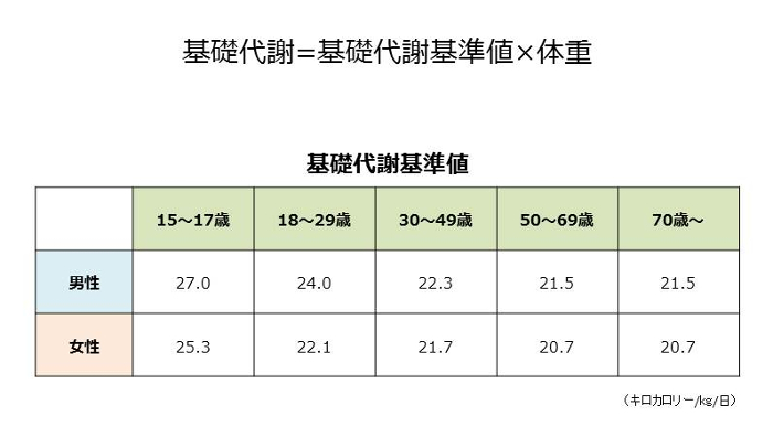 人間は機械と違って、全く体を動かさないときもエネルギーを消費する。体温を保つため、心臓や肺などの止められない臓器を動かすため、脳を動かすため、細胞内の物質の濃さを調節するため…など、これらに必要なエネルギーが「基礎代謝」と呼ばれる。