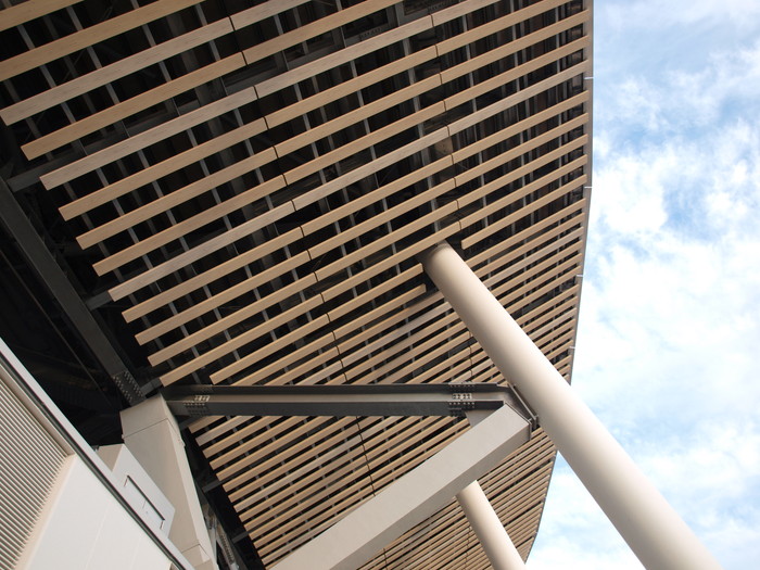 外壁を取り囲む木材は、日本建築特有の庇がイメージされている。下から3段目までの庇を「軒庇(のきびさし)」と呼び、47都道府県から調達したスギ(沖縄はリュウキュウマツ)を使用。それぞれの杉材が、その産地の位置に応じてスタジアム全周に配置されているという。