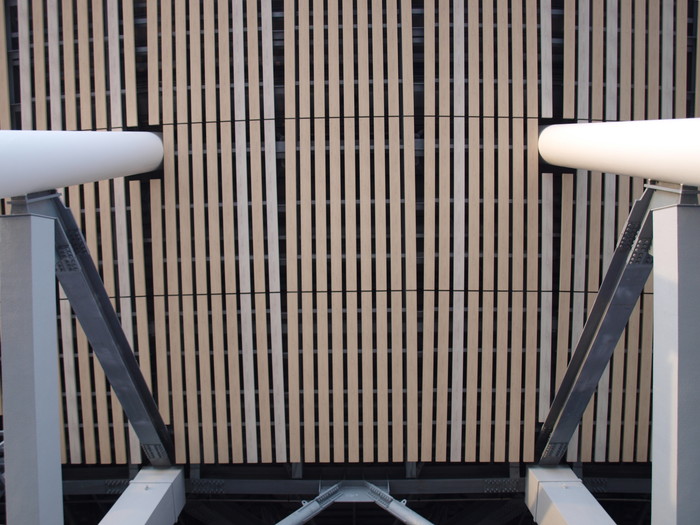冬の冷たい風が吹く北西側は、アルミ材の隙間が広い。寒い北風は隙間を通過させて、そのままスタジアム上空に抜けていく仕組み