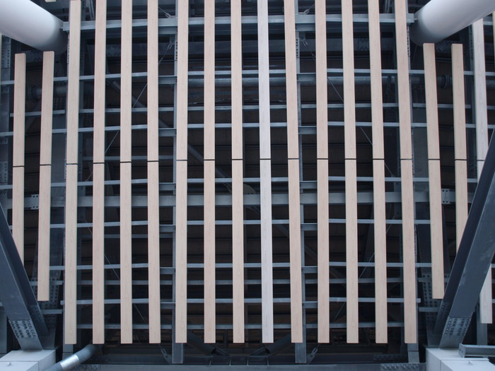 「風の大庇」は、季節によって取り込む風の量を調節するため、方角によって隙間の開口率を変えている。東側は、夏の涼しい風を取り込むためにアルミ材の数(風が当たる面)が多い