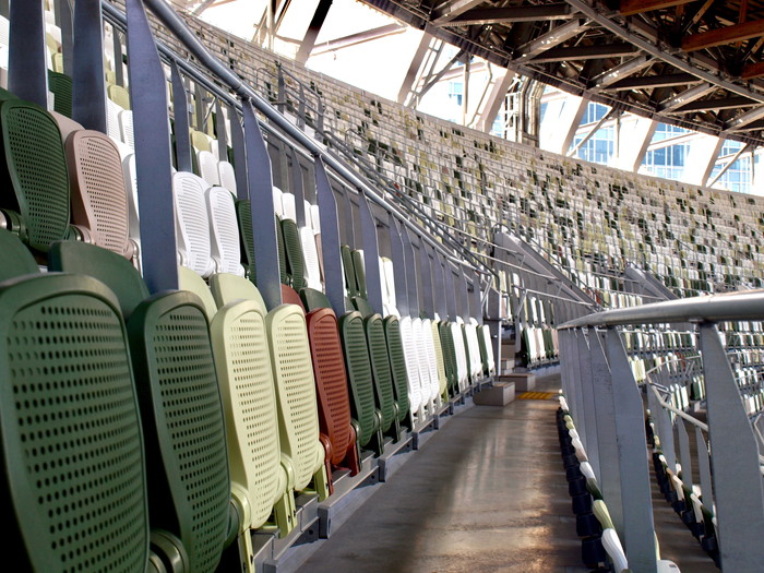 観客席がモザイク調に見えるのは、座席の色がバラバラだから。木漏れ日が差した風景をイメージし、5色のアースカラーで配色されている。フィールドに近い席には大地を連想させる濃い色が多く、上に行くほど木々の緑や空をイメージした白が多い。