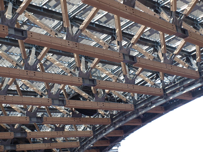 最長部は約60m。屋根の構造材にも、もちろん木材が使われている。鋼鉄と木のハイブリッド材で、カラマツを鉄骨の両側面と下面にボルトで固定することで強度を増している。