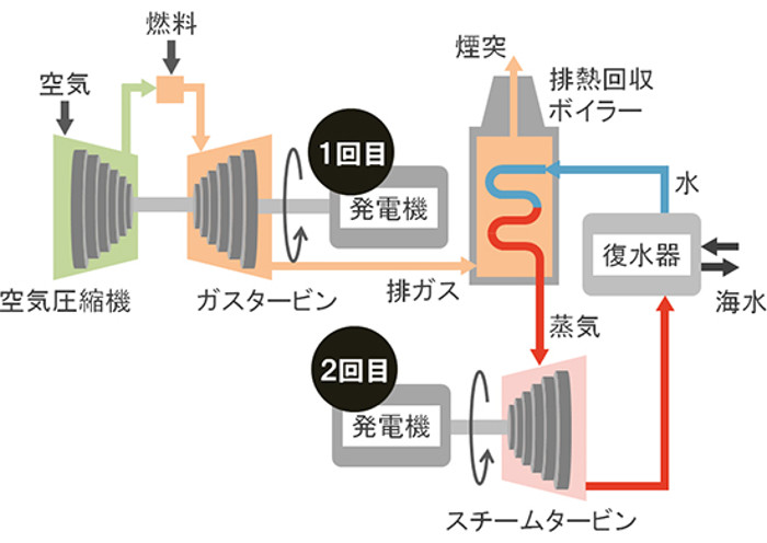 コンバインドサイクル発電という聞き慣れない言葉。これは、燃料を燃やして発生させた高温ガスの圧力でガスタービンを回し、さらにその排ガスで別の蒸気タービンを回すという二重発電方式のことである。