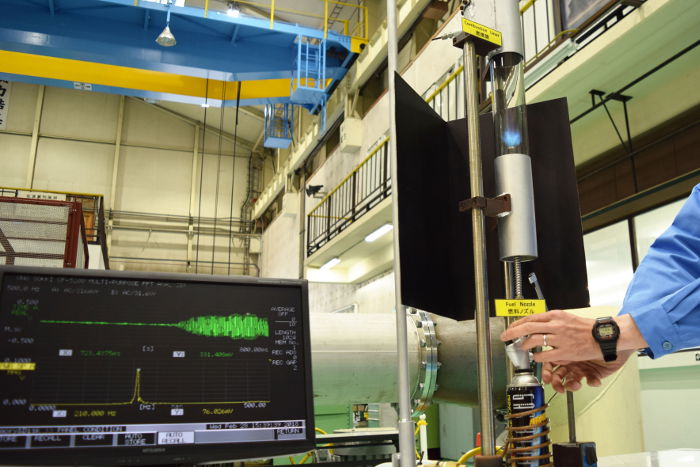大型の低速回転試験装置を使い、フィルム冷却技術による空気の流れなどを検証する空力実験場(写真上)や、燃焼器の故障の原因となる振動現象を抑えるための燃焼振動実験(写真下)を見せてもらった。